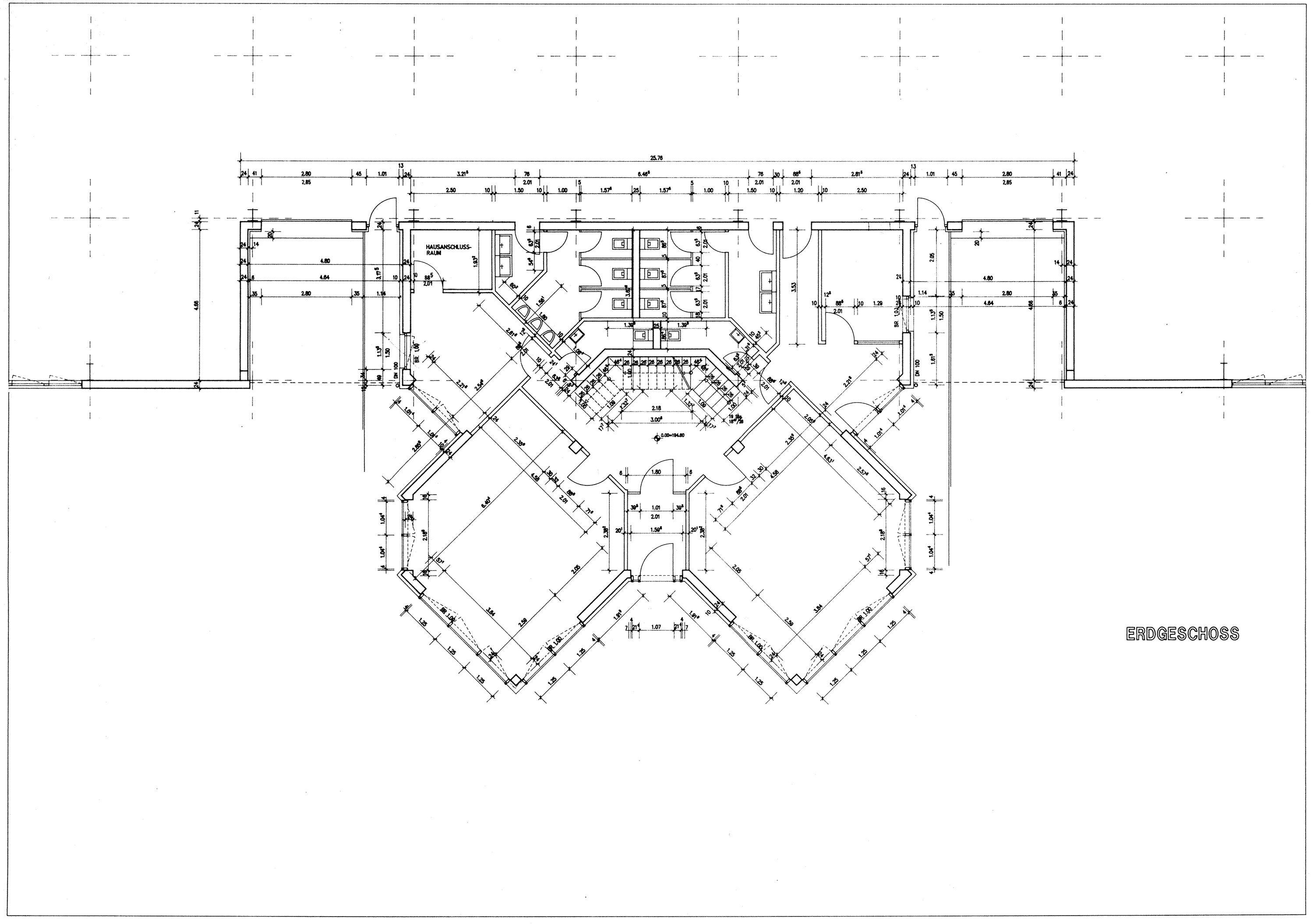 Im Erdgeschoss, das mit einer Treppe zum Obergeschoß und mit einer Brandschutztüre zur Halle verbunden ist, befinden sich 4 Büros, 2 getrennte WC-Anlagen und der zentrale Eingangsbereich. Ebenfalls ist der Hausanschlussraum im Erdgeschoß zu finden.